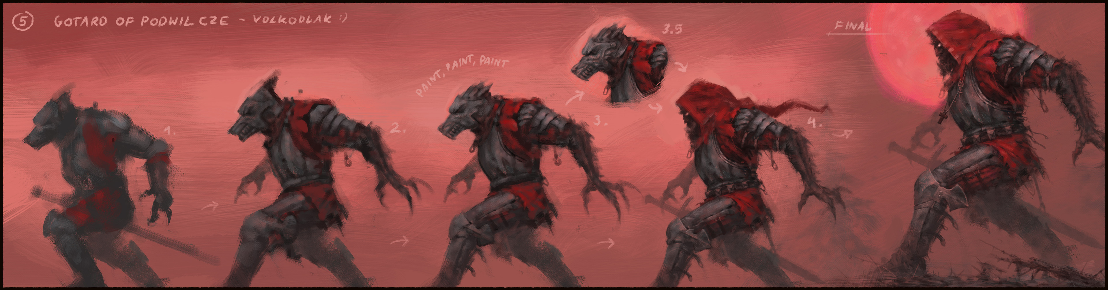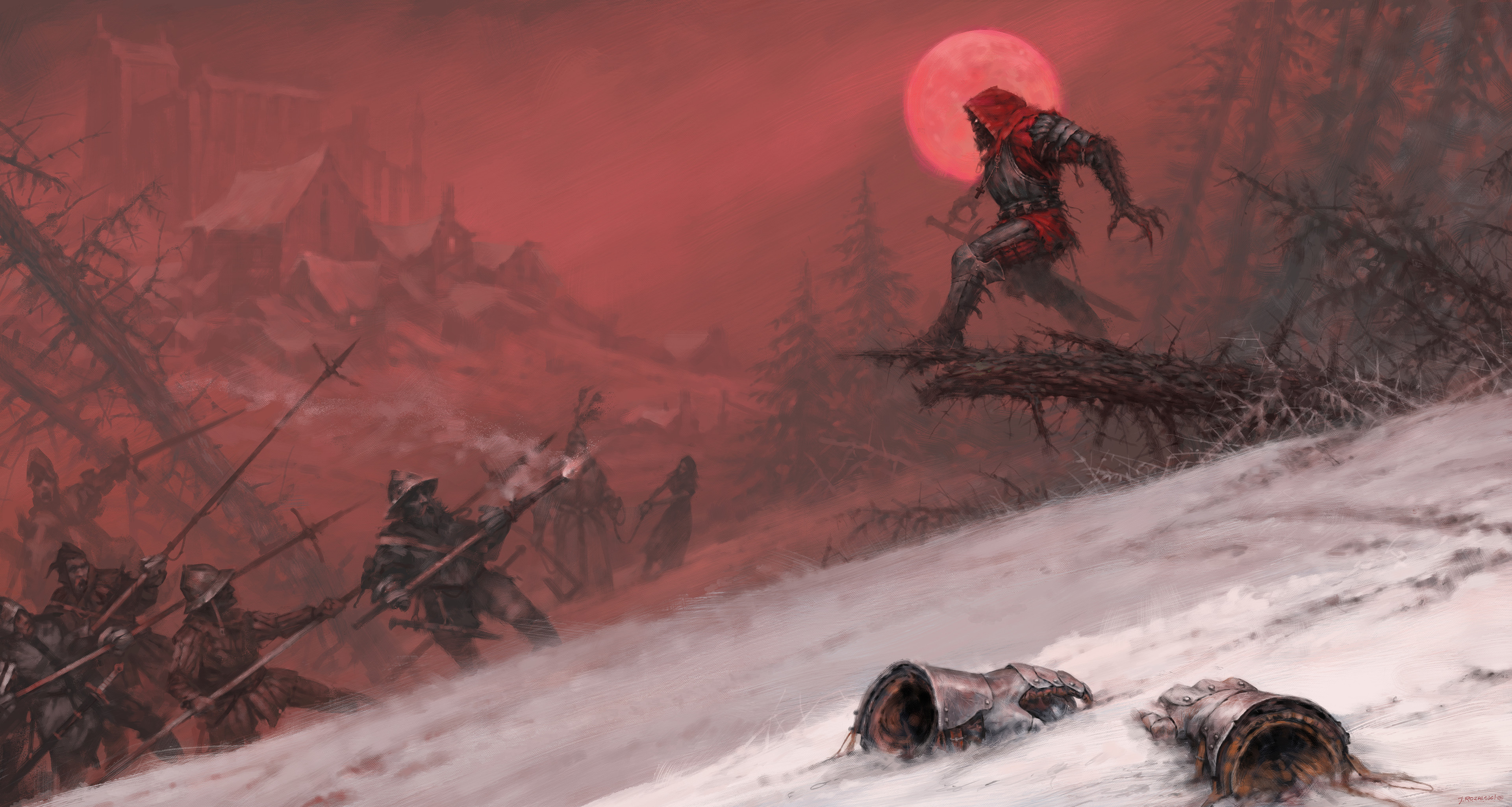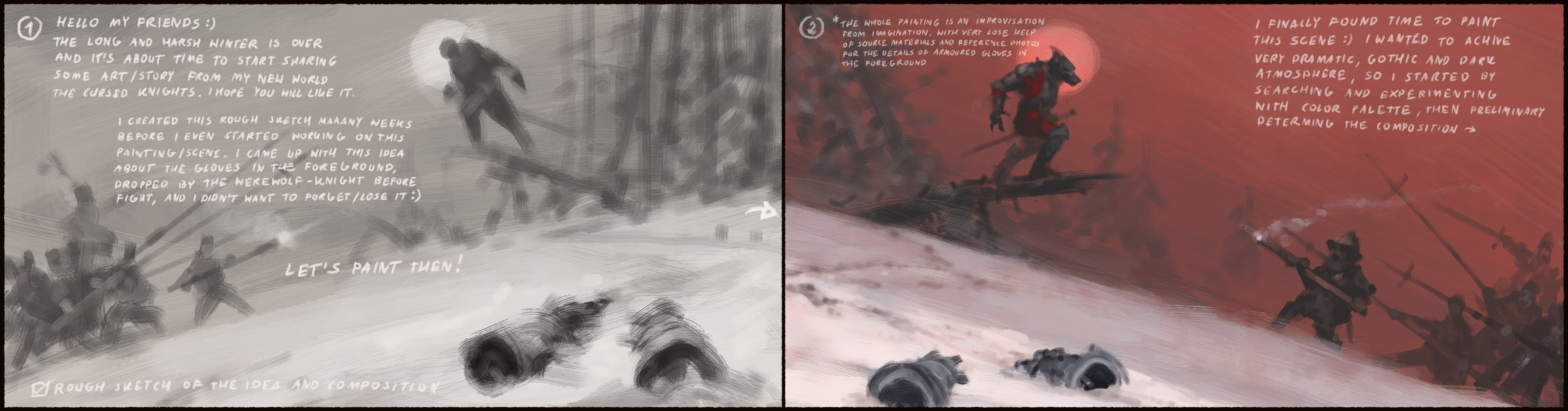 Gniewosz, also known as Gotard, sat down for a moment to rest and catch his breath. Since he lost his horse two days ago, this pursuit became much more of a struggle and with every step through this frozen wasteland his armor felt heavier and heavier. He has been following the Teutonic raiding party through the frozen Baltic for many days. They were heading north. Among the dozens of those poor souls captured by rejza, was his beloved Milena. Gotrad had once visited these area with his father and recognized the coastline of a land known as Courland. Those damned Teutonic Knights are heading towards Alschwangen Castle - He thought. He knew had to do something before they got there or he would never see his golden-haired Milena again! Thoughts were swirling in his head, a strange rush took over his body. Heart started pounding. Blood in the mouth, pain, sweat, panting and growling. He was beginning to lose control! “Pull yourself together! You are a knight, you made a vow! You swore before your Father, before God! You mustn’t! Naaaaaagrrr!" He howled, curled up, his body tensed so much that every part of his armor began to creak. "Agrrrrrrr!". He threw off his armored gloves, tore off the sleeves of gambeson and ran through the forest. Driven by his inner beast, by his curse.